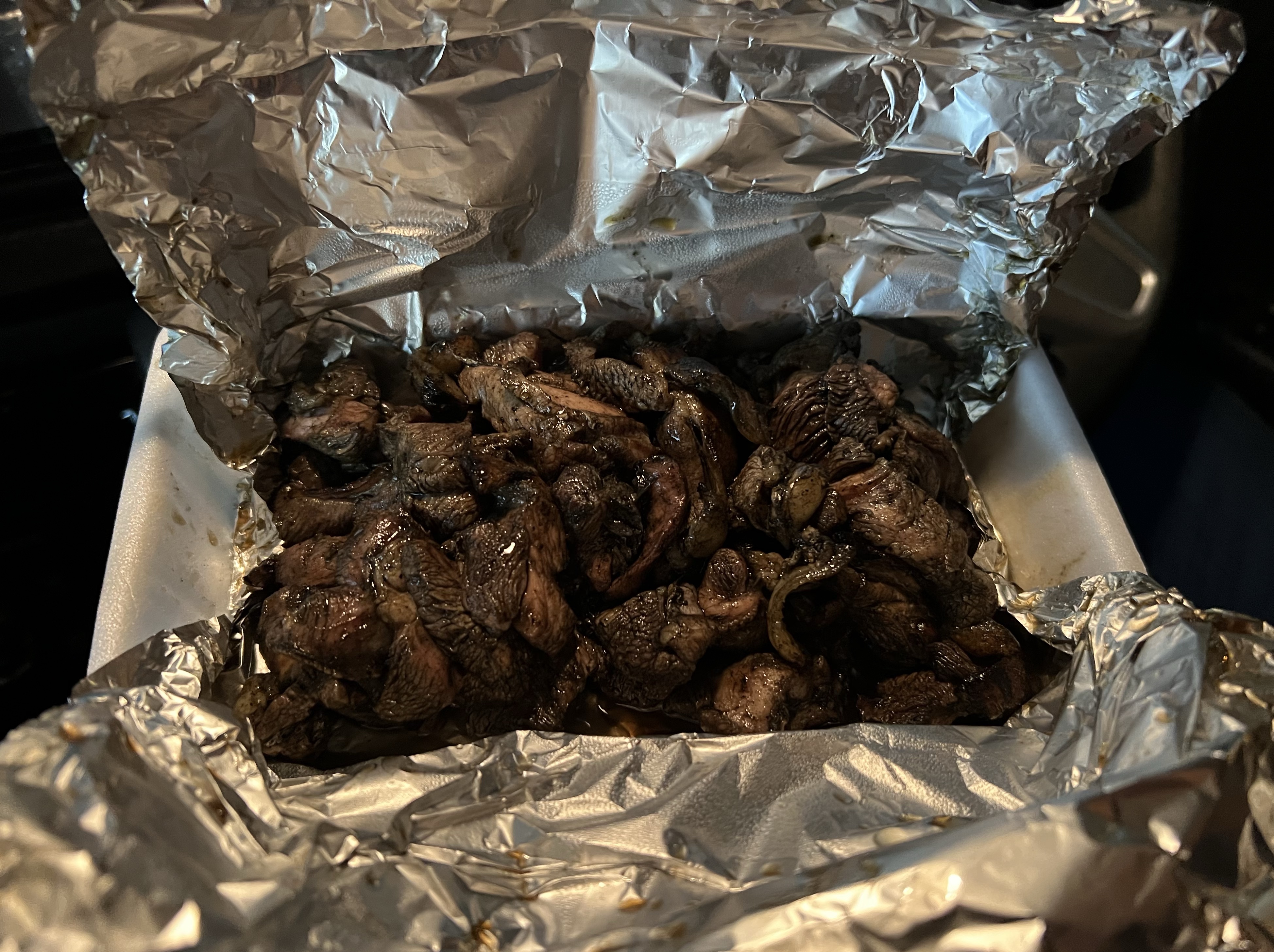 The chef took two semi cooked chicken thighs and began cutting them into smaller pieces. The pieces were then added to a wire basket and cooked over a blazing charcoal flame. The chef was constantly flipping the chicken which probably kept it from sticking. The smell was amazing and we couldn’t wait to dig in. The chef packaged up our food and we headed back to the car. We opened it up and were hit with a plume of delicious chicken scent. The chicken had an incredible smokey char flavor. It was incredibly moist and the meat was tender. We finished up ever last piece.