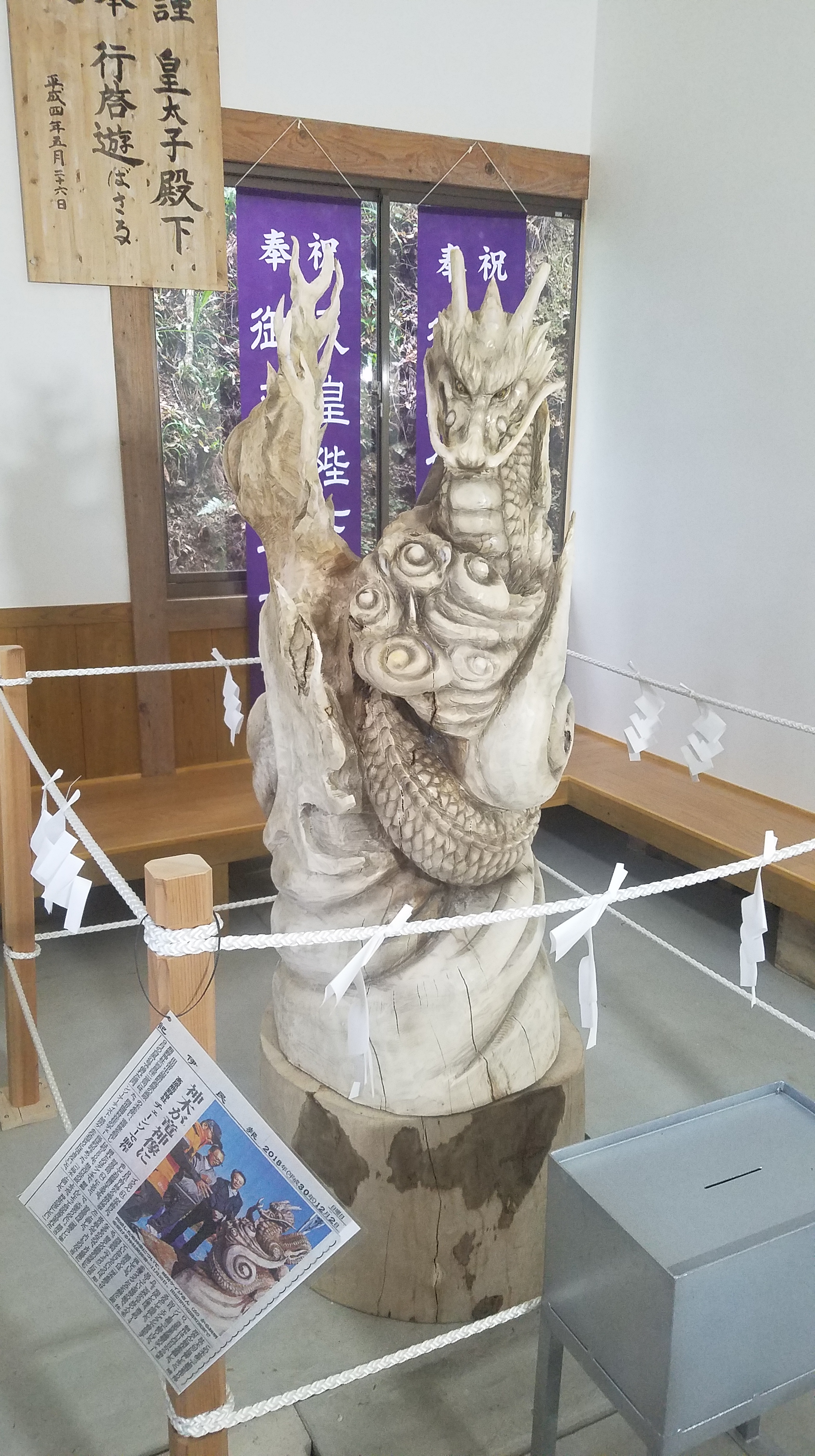 Continuing on the trail, it went from dirt to gravel to paved road as we entered Takahara. We made a stop at Takahara Kumano Shrine, which is small and quaint. We got a stamp, signed a guest book, and admired the dragon statue on display.