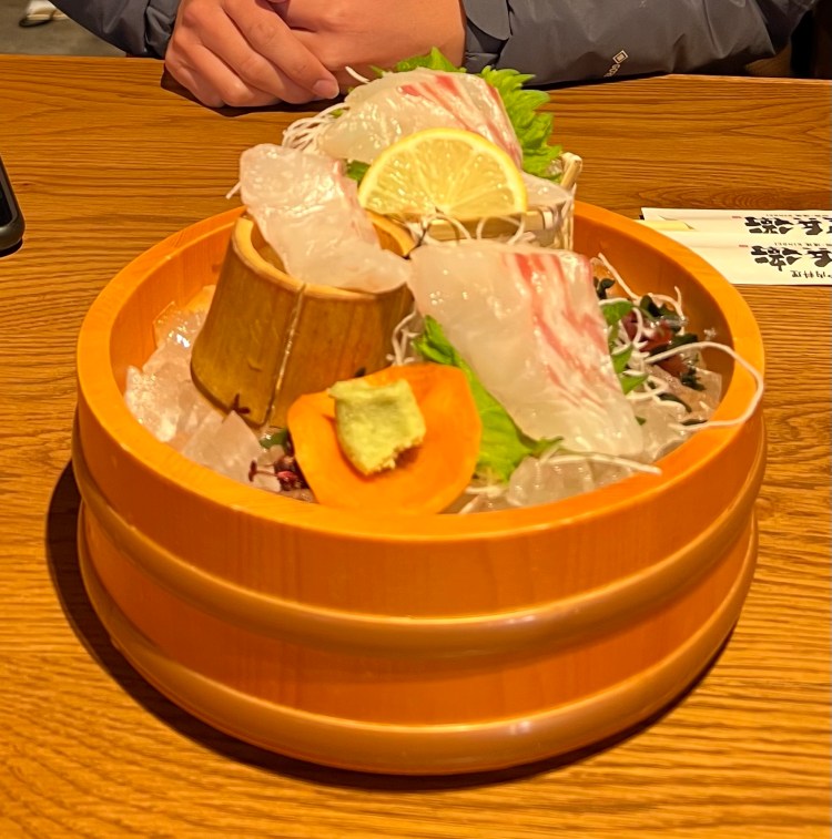 The menu was pretty extensive and there were a wide range of options to choose from. They had ramen, various meat plates, and sashimi combinations. We decided to try their local Matsuyama grilled udon hot pot and an order of their Tai (red snapper) sashimi.