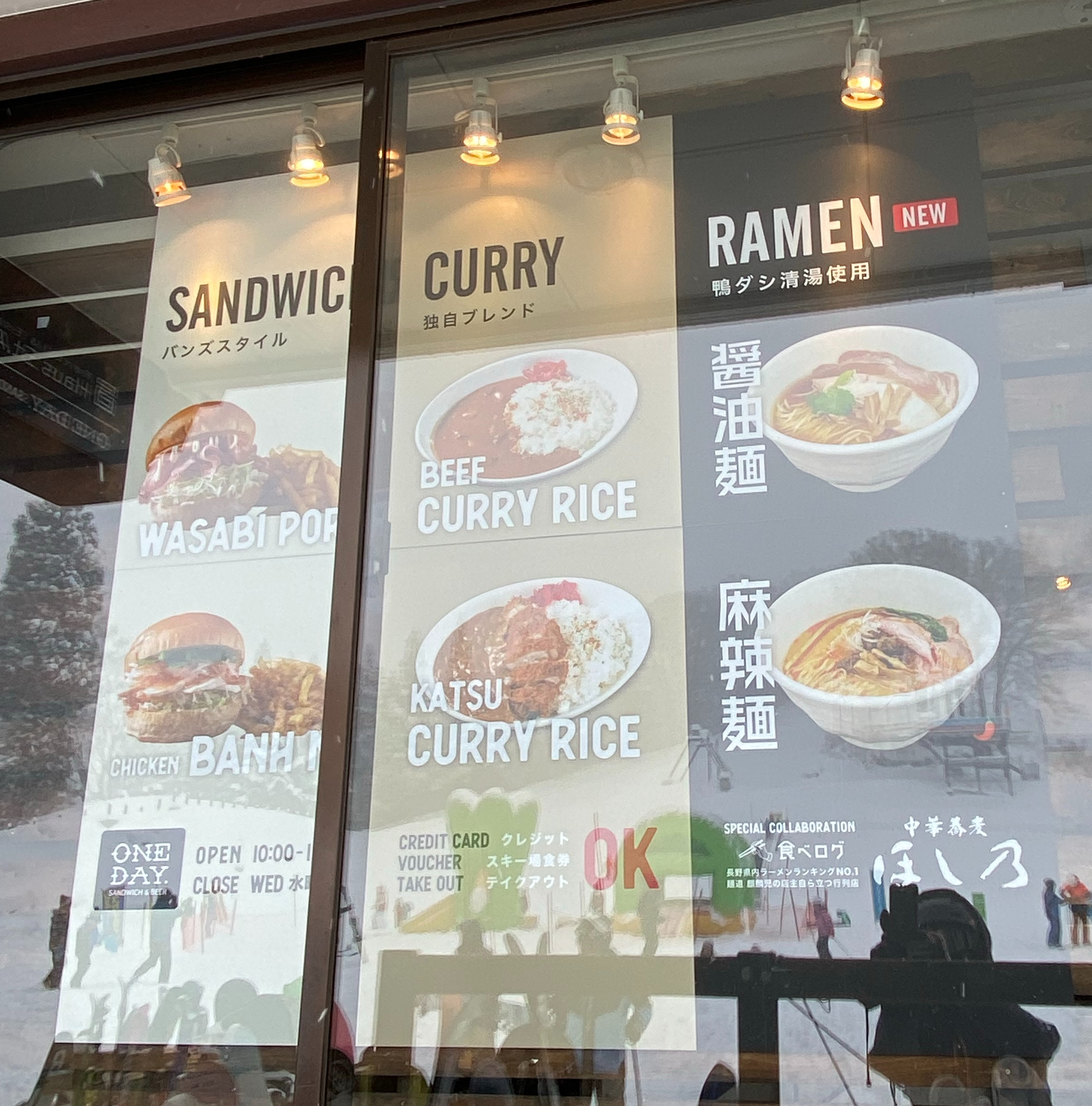 It was about 11:00 so, we decided to break for an early lunch, which turned out to be a good idea. We took the lift back down to the Hikage Gondola Station. For lunch we went to One Day. They were doing a collaboration with a well-known ramen shop in Nagano called Hoshino (清湯醤油 ほし乃).