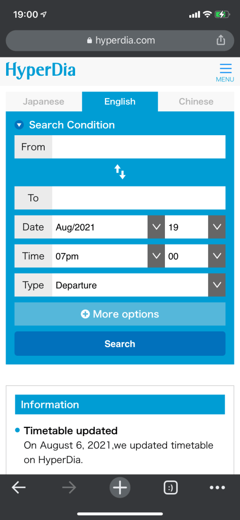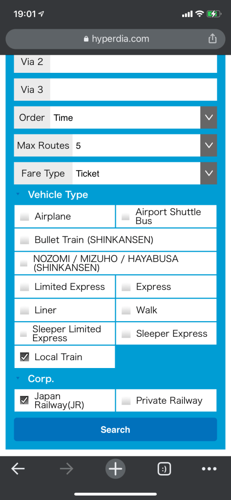 The first and last thing you need to know about planning a Seishun 18 trip is Hyperdia. What is Hyperdia you ask? Its a website used to plan travel trips within Japan. It covers both air and rail and gives accurate train timetables. The site gives you all the information needed to get from one destination to another including the transfers required and the price. The site is free to use and is the premier tool for trip planning within Japan.