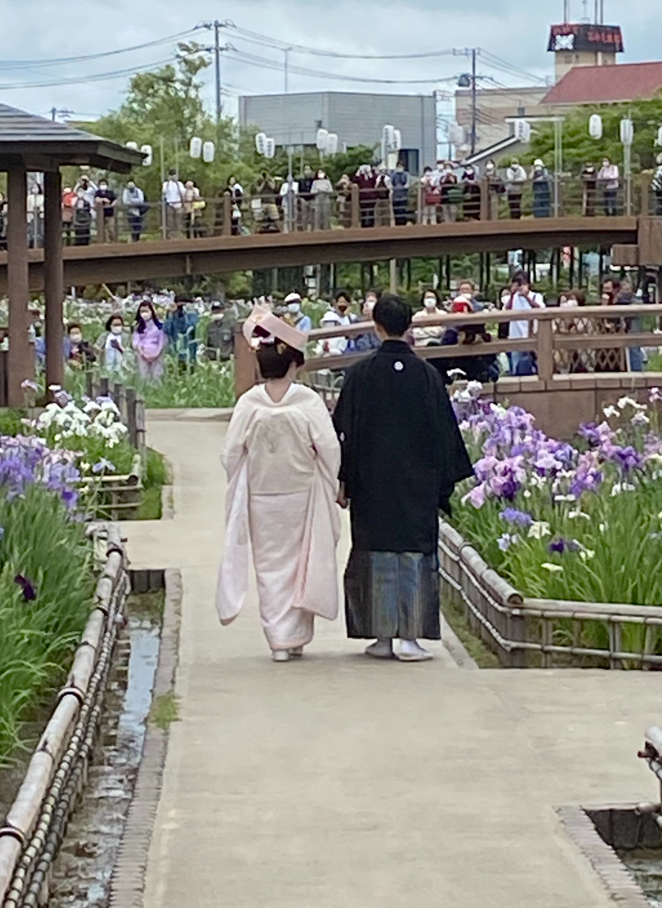 The highlights of the festival are the one million irises in bloom and the Yomeiri-bune (Bride Boat) ceremony. During the ceremony new brides are paraded down the Mae River in sappa (traditional Japanese row boats). The women are dressed in beautiful all white kimono and are accompanied by their parents or matchmaker. The boat stops at the Suigo Itako Ayame Garden where the bride meets her groom and they stroll leisurely through the iris garden. The process of the ceremony tells a beautiful modern love story that is steeped in history and tradition.